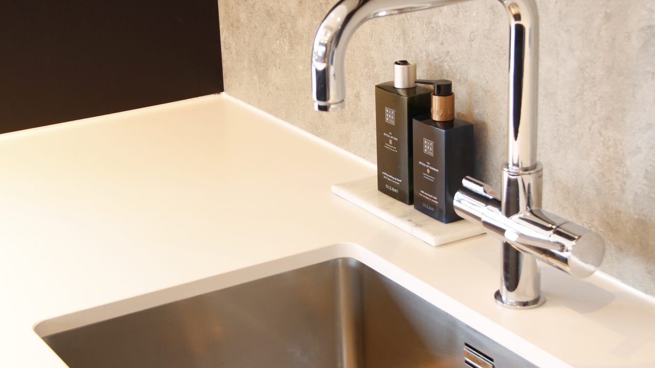 Het donkere hout is gecombineerd met een lichtkleurig composiet werkblad met strak afgewerkte onderbouw spoelbak.